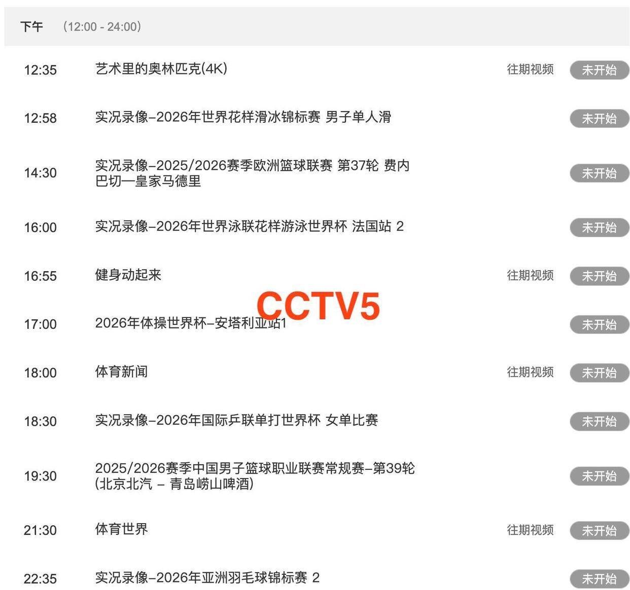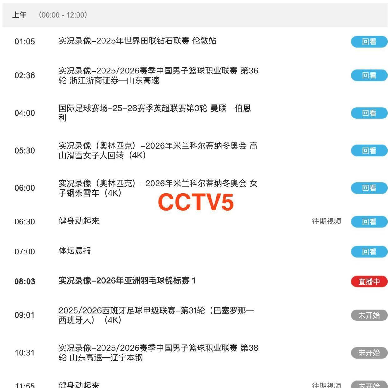 与此同时,央视的体育赛事频道CCTV5 也会在晚间提供不同的赛事选择。 晚上7点33分,该频道安排的是《实况录像-2026年亚洲羽毛球锦标赛》。 对于无法收看电视的观众,还可以通过央视频客户端、咪咕视频等平台,观看WCBA总决赛第一场四川女篮对阵山西女篮,以及其他CBA场次的直播。